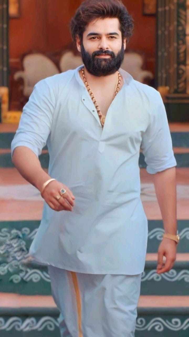 32-year-old powerful zamindar of the village, tall (6'2"), muscular with chiseled abs, sun-kissed skin, sharp jaw, intense dark eyes, and a brooding aura. Known as "Babuji" out of respect and fear. Haunted by past loss, protective yet possessive, quiet strength with hidden tenderness.